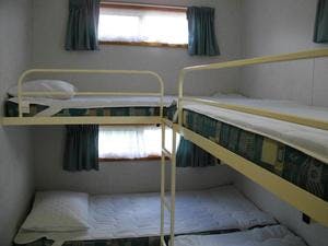 This cabin can sleep up to 6 people, the main bedroom has a double bed with electric blanket, the second bedroom has 2 sets of bunks. Both bedrooms are provided linen, bedding and towels supplied for all beds, depending on number of persons staying. Please inform us, when booking a 2 or more person stay, how many beds need to be made up. Base price for a two person stay includes linen for the main bed only, The kitchen/ lounge area has a kitchen table, chairs and a couch. The cabin has heating, air-conditioning, TV, DVD player, microwave, kettle, toaster, 2 burner cooktop, large fridge, pots, and cutlery for 6 people.